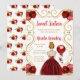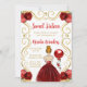 Este doce 16 convite apresenta uma elegante estrutura de ouro, uma bela princesa de cabelo vermelho e um vestido vermelho, flores e um balão. Isto é perfeito para uma doce festa de aniversário de dezesseis.