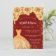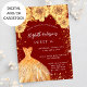 Um convite moderno, na moda e glamouroso para uma doce festa de aniversário 16, 16. Um fundo vermelho com poeira falsa dourada, um vestido e ouros, flores. O nome é escrito com um moderno estilo escrito à mão. Personalize e adicione os detalhes da sua festa.