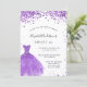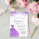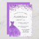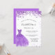 Um convite moderno, na moda e glamouroso para uma doce festa de aniversário 16, 16. Na frente: Um fundo branco com violeta, brilhos lilás, um vestido violeta. O nome é escrito com um moderno estilo escrito à mão. Personalize e adicione os detalhes da sua festa.