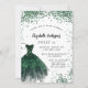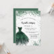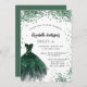 Um convite moderno, na moda e glamouroso para uma doce festa de aniversário 16, 16. Na frente: Um fundo branco com brilhos verdes, um vestido verde esmeralda. O nome é escrito com um moderno estilo escrito à mão. Personalize e adicione os detalhes da sua festa.