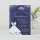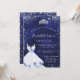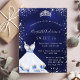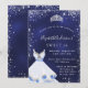 Um convite moderno, na moda e glamouroso para uma doce festa de aniversário 16, 16. Um fundo azul da meia-noite com pó falso prateado, tiara e vestido. A cor azul é irregular. O nome é escrito com um moderno estilo escrito à mão. Personalize e adicione os detalhes da sua festa.