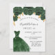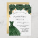 Um convite moderno, na moda e glamouroso para uma doce festa de aniversário 16, 16. Na frente: Um fundo branco com um vestido verde esmeralda e rosas verdes, florais. O nome é escrito com um moderno estilo escrito à mão. Personalize e adicione os detalhes da sua festa. Fundo: fundo de ouro falso.