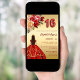 Um convite moderno, na moda e glamouroso para uma doce festa de aniversário 16, 16. Um fundo de ouro falso, uma garota vestindo um vestido vermelho e dourado e rosas vermelhos, cor-de-rosa e ouro, florais. O nome é escrito com um moderno estilo escrito à mão. Personalize e adicione os detalhes da sua festa.