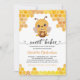 Este adorável convite para chás de fraldas apresenta a imagem de texto "Querida querida" com abelhas segurando um pote de mel cercado por favos de mel. A parte de trás apresenta pentes de mel, potes de mel e abelhas voadoras. Fácil de personalizar clicando em "Personalizar".