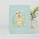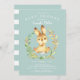 Adorável convite para bebês com coelhinho doce rodeado por uma coroa em fundo verde para um chá neutro em termos de gênero. Sacudir nosso convite para ver uma coordenação de volta para um toque especial extra.