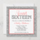 Um convite de aniversário moderno do doce dezesseis. Caracterizando um brilho da prata do falso projete com acentos de cor-de-rosa e preto corais. O design é gráficos impressos plano - BRILHO NAO REAL.