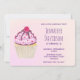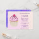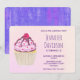 Um convite de festa de aniversário com uma ilustração de um delicioso cupcake. Cobertura rosa e gotas de chocolate. Um porta-cupcake amarelo e uma framboesa no topo. Delicioso! O verso tem uma textura roxa abstrata com corações espalhados.