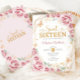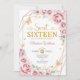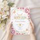 O convite para comemoração de 16, 16, cor-de-rosa, ouro e branco. Apresenta fontes de script, borboletas douradas, rosas rosa-pinceladas e tiara. Perfeito para uma elegante princesa estilo glam doce celebração de 16 anos. Personalize com seus próprios detalhes. Impressos convites Zazzle ou modelo de impressão digital instantânea para download.