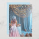 Um belo salão de festas com uma garota adolescente vestindo um lindo vestido rosa e branco na sua festa dos Dezesseis. A sala é decorada com cortinas azuis, luzes elegantes de cordas e brilho bonito. Personalize com suas informações de festa, nome de garotas etc.