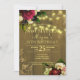 Um belo e rústico convite tradicional de 16 anos, com flores buquês de burlões escuros, vibrantes rosas de creme de cor vermelha e de pêssego, e peônias, cordas de luzes cintilantes e um guião de caligrafia em ouro falso em forma de chic sobre um fundo de madeira bege castanho. +++++++++++ O convite também é adequado para qualquer outra noite de verão ou outono no país rústico / quintal exterior / festas de aniversário de marco agrícola, comemorações ou aniversários.
