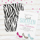 Esta design apresenta um convite de aniversário para uma adolescente adolescente com uma Girly, calçados de moda excelente para dezesseis doces 16, com joias brilhantes de borda clássica, elegância sofisticada por rico, elegância minimalista moderna, meninas bailes de formatura femininas, simples e simples, com caligrafia clássica de rico, uma tendência de na moda legal tipografia, com tigre-tigre animal preto salto alto