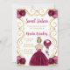 Este doce 16 convite apresenta uma elegante estrutura de ouro, uma bela princesa com cabelo louro e um vestido vermelho burgundy, flores e um balão. Isto é perfeito para uma doce festa de aniversário de dezesseis.