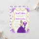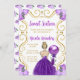 Este doce 16 convite apresenta uma elegante estrutura de ouro, uma bela princesa com cabelo louro e um vestido roxo, flores e um balão. Isto é perfeito para uma doce festa de aniversário de dezesseis.