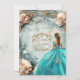 Lindo tema azul para sua celebração. A adolescente está vestindo um lindo vestido azul brilhante e brilhante. Fundo é uma cor azul-d'água com moldura dourada e rosas cor-de-rosa Há uma bonito coroa prateada cintilante na frente.