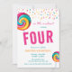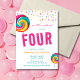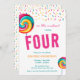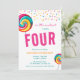 Estes convites de festas de aniversário bonitos apresentam um doce límpido colorido colorido d'água com borda decorativa de bordas de borrifadas. Personalize os convites de festa de aniversário adicionando o nome, a idade e os detalhes da festa do seu filho.