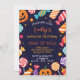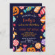 Prontos para me divertir? Este doce convite de aniversário do Dia das Bruxas apresenta um pano de fundo escuro, um palco para um turbilhão de doces vibrantes, lolipps clássicos e lanternas sorridentes. O elegante roteiro laranja destaca os detalhes do partido, garantindo que o "Dia de Nascimento Spooktacular" do seu filho se destaque. Este modelo personalizável facilita a personalização de cada detalhe, definindo o tom perfeito e festivo para um evento memorável.