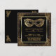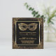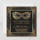 Convites elegantes, doces 16 mascarada, preto e dourado, com sotaques falsos dourados- Rolos de aparência metálica de ouro falso-chic decoram os cantos contra um fundo preto de carvão com uma estrutura de aparência quadrada de metal dourado falso e aparência de borda dourada. Uma cor de ouro metálico, design de máscara de mascarada, enfeite o topo. Leia por favor junte-se à Mascarada Ball Honorando em letras douradas com o nome personalizado abaixo em chic, guião dourado. Outros detalhes personalizados de dezesseis participantes, abaixo, em letras hued douradas, incluindo informações de RSVP. As cores e estilos do texto podem ser alterados para se adequarem a você. A parte de trás tem pergaminhos de ouro nos cantos contra um fundo preto sólido. Bonita para o tema preto e ouro 16ª festas de aniversário ou estilos de Deco de Arte, assim como temas de glama Gatsby do Excelente.