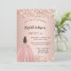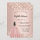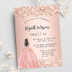 Um convite moderno, na moda e glamouroso para uma doce festa de aniversário 16, 16. Um fundo rosa de ouro com poeira falsa de ouro, uma garota vestindo um vestido de bola. O nome é escrito com um moderno estilo escrito à mão. Personalize e adicione os detalhes da sua festa.