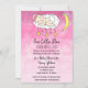 Uma linda bebê branca dormindo sobre uma nuvem rodeada de corações e estrelas, convites de chá de bebê com fundo rosa.