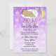 Menina bebê roxo estrelas e luas, étnico hispânico bebê dormindo em um convite de festa de bebê em nuvem.