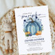 Celebre a chegada de uma doce abóbora com este charmoso design de chá de fraldas! Apresentando uma abóbora de aquarela azul macia cercada por folhagem de outono, este tema inspirado no outono é perfeito para acolher um bebê. As palavras podem ser facilmente editadas para ajustado de seu evento específico. As cores e fontes em segundo plano são totalmente editáveis se você clicar no botão 'personalizar mais'.