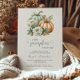Este belo convite para chás de fraldas apresenta uma imagem aquosa de duas abóboras em tons pastéis de verde-sábio e laranja, enfeitiçada com flores brancas e laranja. Abaixo, aparecem as palavras "uma pequena abóbora está a caminho", com a palavra "abóbora" em guião verde de sábio decorado com curlicudos na imitação de vinhas de abóbora. Personalize o texto com o nome da futura mãe no roteiro laranja e os detalhes na fonte serif de cinzas de carvão em um fundo bege. Ideal para um chá de fraldas de queda neutro em termos de gênero.