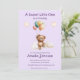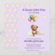 Um ursinho bonitinho pendurado em um punhado de balões coloridos voa pelas nuvens com um casal de estrelas sobre o anúncio "Um Pequeno Doce está a caminho." Todo texto pode ser facilmente alterado para suas informações.