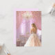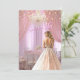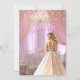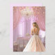 Um belo salão de baile com uma garota adolescente vestindo um lindo vestido cor-de-rosa com sotaques de brilho prateado. Doce Dezesseis é um texto rosa brilhante. A sala é decorada com cortinas cor-de-rosa, mesa elegante e cadeiras para hóspedes, cintilantes cristais e bonito luzes brilhantes. Personalize com suas informações de festa, nome de garotas etc.