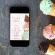 Convite para sorvetes, fácil de personalizar para qualquer festa de aniversário etária, para convidar seus amigos e familiares a se juntarem a você para uma "doce celebração". O design tem uma inscrição cinzenta fofinha, borrifos e cones de sorvete com gelato de sabor a morango, menta, baunilha e chocolate.