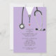 Creative medical school graduation party invites featuring lavender hospital scrubs and stethoscope art. Edit text to create unique doctor party invitation.