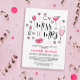 Convite para festa de solteira Chic com rabiscos bonitos em preto, rosa quente e rosa pálido — bebidas, batom, boca brilhante, pequenos corações, um anel de diamante brilhante, e balão — em torno das palavras Miss to Mrs in bonito calliographic. A parte traseira apresenta faixas em negrito em branco, preto e rosa quente.