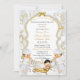Linda menina e dois meninos em suas roupas batizantes com colar de cruz de ouro. O fundo do convite é o cetim branco, o filigre dourado, uma moldura dourada e prateada e um embelezamento do arco. A parte de trás é enfeitada com padrão de flores douradas e fita dourada sobre fundo branco de cetim.