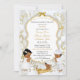 Linda menina e dois meninos em suas roupas batizantes com colar de cruz de ouro. O fundo do convite é o cetim branco, o filigre dourado, uma moldura dourada e prateada e um embelezamento do arco. A parte de trás é enfeitada com padrão de flores douradas e fita dourada sobre fundo branco de cetim.