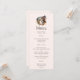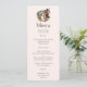 Cartão de menu com uma imagem com dois cavalos. Vestindo bandas decorativas. Cercados por penas e folhagem.