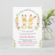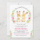 Um belo e colorido convite "Dois coelhos doces estão a caminho" para um chá de fraldas gêmeo ou borrifo.