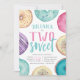 Os segundos convites de aniversário do tema da sobremesa, bonitos, apresentam "[Name] é dois doces" no centro com os detalhes da sua festa abaixo, cercados por ilustrações de rosquinha de aquarela em neutrais, rosa e aqua.