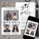 É uma festa de formatura dupla! Anuncie a conquista de dois formandos e convide a família e os amigos a celebrarem com convites personalizados de festa de formatura. As imagens e o texto são simples de personalizar, e as cores podem ser personalizadas usando a ferramenta design Zazzle. (DICA DE IMAGEM: Uma maneira fácil de posicionar uma foto exatamente como você deseja é recortá-la antes de carregá-la no site do Zazzle.) Este modelo é uma placa de lançamento combinada na parte frontal com o convite de festas formando na parte traseira. O design moderno preto e branco apresenta uma caligrafia de script de estilo manuscrito com um boné de conselho de argamassa, uma elegante tipografia clássica e três fotos de sua escolha, como fotos de mais velho ou imagens da cerimônia de início. Este convite de formatura é uma forma na moda para anunciar uma celebração especial para dois formandos, como irmãos, melhores amigos, primos, gêmeos, irmão e irmã, etc. Parabéns para ambos os formandos!