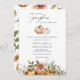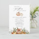 Convite para chá de fraldas temático da abóbora. Design apresenta uma abóbora com flores rústicas e folhagem. Personalize com suas informações ou clique em "Clique para personalizar mais" para editar estilos de fonte, tamanho e cores.