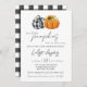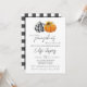 Duas pequenas abóboras estão a caminho! Celebrar a futura mãe com um convite de chá de fraldas do tema do outono. Duas abóboras bonitinhas em xadrez de búfalo preto e branco e laranja clássico adicionam um pouco de encanto esquisito e rústico ao convite. Um girassol adora a abóbora laranja. A parte de trás apresenta uma xadrez de búfalo preto e branco. Todos os detalhes podem ser personalizados. Este é o convite perfeito para o chá de fraldas de outono, neutro em termos de gênero, para gêmeos.