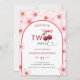 Caligrafia cardíaca "Dois doces" convite de aniversário de criança com design de arca elegante e flores de cereja com aquarela.