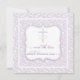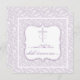Cruz cristã com alianças de casamento entrelaçadas inserir branco contra o fundo roxo elegante do redemoinho do damasco, convite nupcial quadrado sofisticado com trecho do verso da bíblia do evangelho de marca, 10:7,8: "Por esta razão um homem deixará seus pai e mãe, e seja juntado a sua esposa, e os dois transformar-se-ão uma carne. Assim são já não dois, mas um." Comemore seu casamento quando compartilhar de seu amor para o cristo com a esta personalizou customizável convida da loja de lembranças cristã da fé.