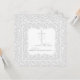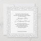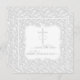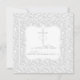 Cruz cristã com alianças de casamento entrelaçadas inserir branco contra o fundo elegante do redemoinho do damasco das cinzas de prata, convite nupcial quadrado sofisticado com trecho do verso da bíblia do evangelho de marca, 10:7,8: "Por esta razão um homem deixará seus pai e mãe, e seja juntado a sua esposa, e os dois transformar-se-ão uma carne. Assim são já não dois, mas um." Comemore seu casamento quando compartilhar de seu amor para o cristo com este barato personalizou cinzas de prata customizáveis e o branco convida da loja cristã do presente da fé.