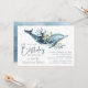 Elegante, convites de festas de aniversários temáticos do oceano com um golfinho pintado de cor d'água adornada com flores brancas, folhas verdes e coral azul. Personalize os convites de festas de aniversários bonitinhos de golfinho adicionando o nome, a idade e os detalhes da festa da aniversariante ou do menino. O convite reverte para um fundo de aquarela azul-oceano.