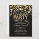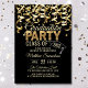 Convites de graduação moderna em matiz dourada e preta. Streamers com faux gold foil confetti. Letras brilhantes de ouro falsas e boné de formatura / chapéu. Perfeito para aquela festa de estudantes de quadril. A parte traseira do cartão tem CLASS of YEAR com espaço para adicionar o nome da escola.