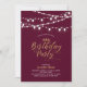 Celebre um dia especial com este convite de aniversário de ouro chico! Este design apresenta luzes de cordas e uma tipografia de guião na moda dourada com fundo vermelho burgundy. Você pode personalizar o texto para qualquer aniversário de idade/marco. Mais convites de aniversário para adultos e material de festa estão disponíveis no meu compro BaraBomDesign.