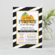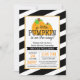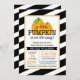 Um design de chá de fraldas de abóbora moderno. Apresentando riscas brancas e pretas diagonais, borda falsa de dourado e abóboras cor de água laranja. Um convite para um chá de fraldas temático do Dia das Bruxas para uma garota ou um garoto.
