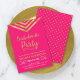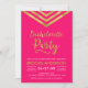Convite moderno à Festa de solteira, com um géron geométrico elegante e a palavra "Festa de solteira" em ouro falso contra fundo rosa vibrante. A placa inclui um padrão correspondente do lado traseiro. Veja os itens correspondentes aqui http://www.zazzle.com/collections/modern_faux_gold_chevron_celebration_collection-119531050277382712?rf=238364477188679314 Personalize-o substituindo o texto do marcador de posição para adicionar suas informações. Para obter mais opções, clique no botão "Personalizar". *Observe que a Marca d'água do Zazzle que aparece na visualização de zoom NÃO aparecerá no produto impresso final. © Rosewood e Citrus