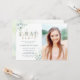Este convite à festa de formatura apresenta cor d'água, eucalipto e folhas verdes pintadas com letras botânicas de ouro e fundo d'água no verso. Para personalização mais avançada deste design, clique no link Personalizar mais para alterar a fonte, o tamanho e a cor.