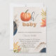 Projetado para nossa coleção de Chás de fraldas Pequenos Pumpkin, este Cartão de Convite para Bebês personalizável apresenta fundo cor-de-rosa pincelado, abóbora verde e laranja, texto brilhante a ouro rosa e folhas de ouro com fontes de escrita manual. Itens correspondentes disponíveis.