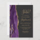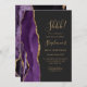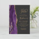 Esta elegante surpresa do 50º convite de aniversário apresenta uma cor d'água púrpura e borda agitada com falso brilho dourado. O texto personalizável combina manuscrito dourado, fontes em copperplate e itálico em um fundo preto de slate. Edite o nome, a idade e outros detalhes. O verso apresenta um design de agate roxo e dourado correspondente.